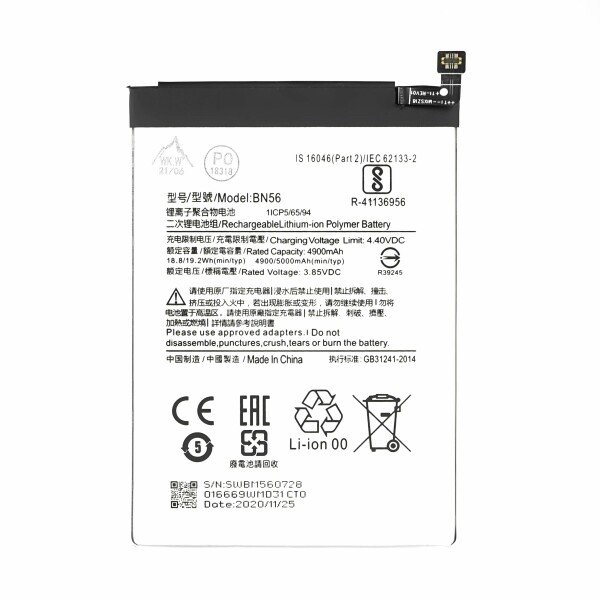 بطارية BN56 هي مصدر الطاقة الأساسي لأجهزة شاومي الاقتصادية لعام 2020، وتمتاز بطول العمر الافتراضي والأداء المستقر تحت ضغط الاستخدام. إليك التفاصيل التقنية الدقيقة لهذه البطارية: