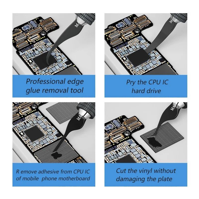 جراحة الـ ICs والمعالجات: بفضل سماكتها المصغرة، تتيح لك الشفرات رفع المعالجات (CPU) ودوائر التردد اللاسلكي (Baseband) بأمان، مما يقلل من مخاطر “قلع المسارات” (Pad Ripping).