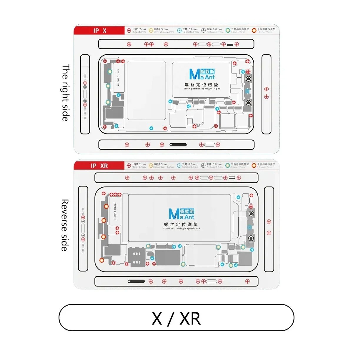هذا النموذج من لوحة MaAnt Magnetized Pad الخاص بـ iPhone X و iPhone XR هو مثال حي على هندسة التبسيط في ورش الصيانة. بما أنك تتعامل مع أجهزة آيفون ذات تصميم داخلي مختلف تماماً بين هذين الموديلين، فهذه اللوحة تمنع أي تداخل بين براغي الجهازين.