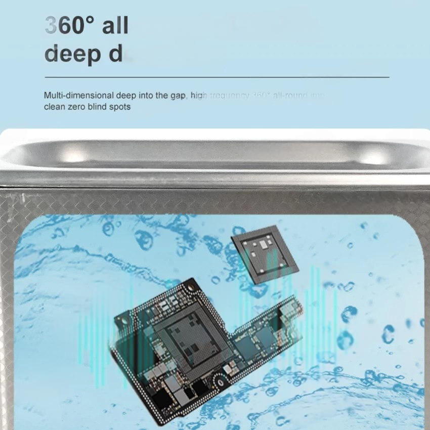 • قوة الموجات (Ultrasonic Power): تعمل بتردد عالٍ (غالباً 40kHz) يولد فقاعات مجهرية تنفجر عند ملامسة الأسطح، مما يفتت الأملاح والصدأ في أضيق الأماكن تحت المعالج والذاكرة.