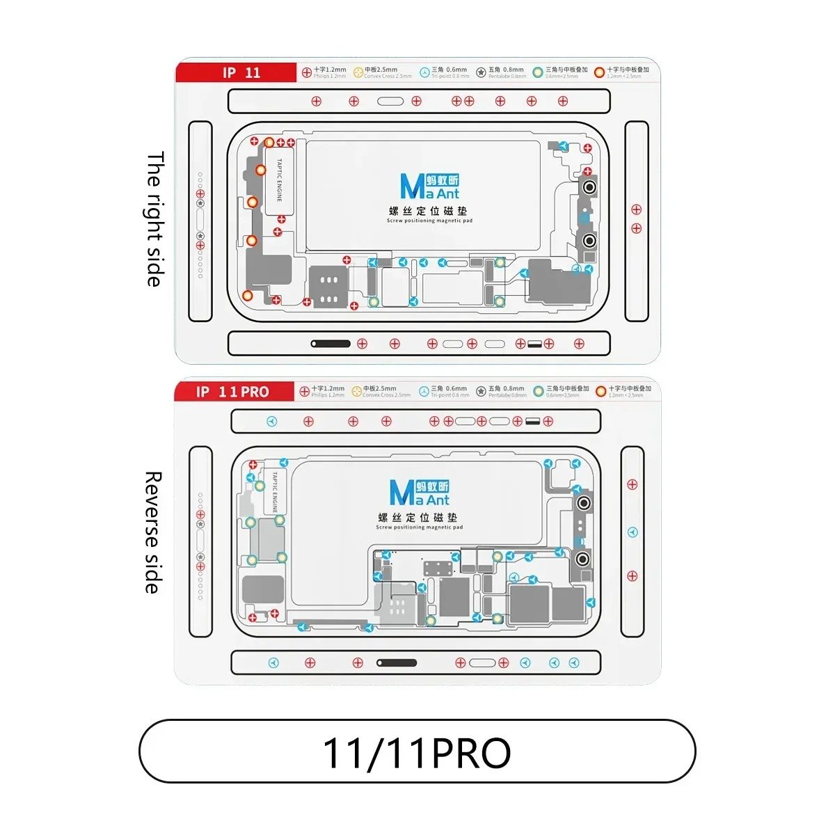 هنا تكمن الحرفية! بوردة الـ 11 Pro مصممة بشكل مختلف تماماً (Stacked logic board). ستجد براغي التثبيت الملونة بالأزرق والأحمر في المخطط تشير إلى براغي “الساندوتش”؛ هذه البراغي تحديداً هي الأخطر. إذا قمت بتبديل برغي منها ببرغي آخر أطول، فستقوم بـ “ثقب” الطبقات الداخلية (Layer Puncture)، مما يتسبب في أعطال لا يمكن إصلاحها (مثل فقدان الشبكة أو عطل الـ CPU).