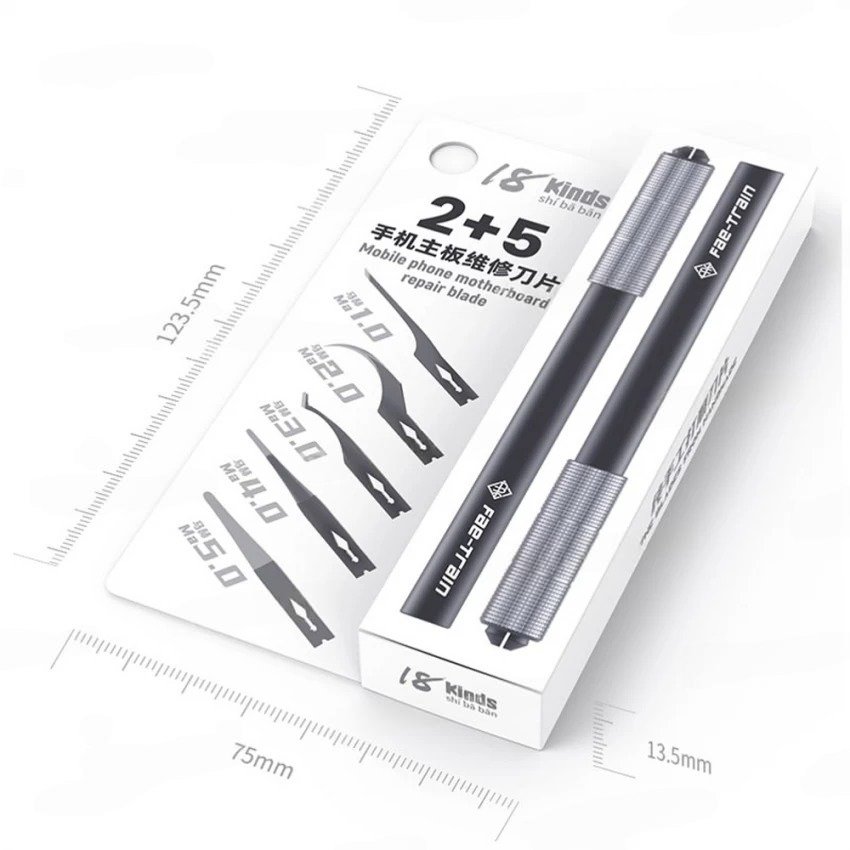 رقم 2+5 يشير عادةً إلى وجود مقبضين (Handles) مع 5 مجموعات رئيسية من الشفرات المتخصصة، مما يمنحك مرونة عالية في العمل المجهري على البوردات