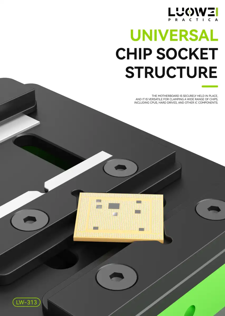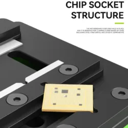 تثبيت الأي سيهات (IC Slot): تحتوي القاعدة على فتحات مخصصة ومدرجة بأحجام مختلفة لتثبيت الأي سيهات (CPU, RAM, NAND) أثناء عملية تنظيف الغراء (Underfill) باستخدام الشفرات.