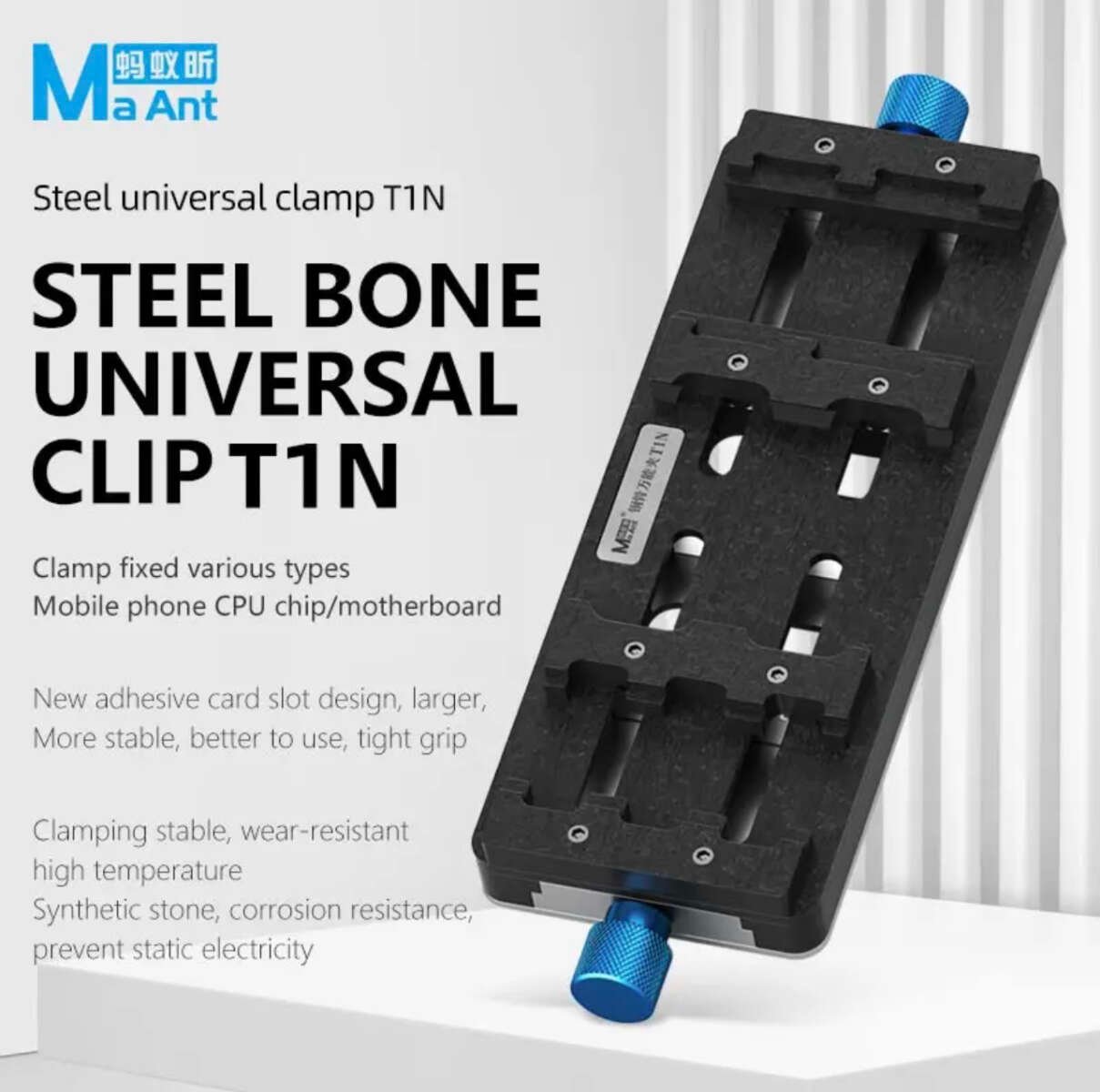 أكبر مشكلة عند العمل تحت الميكروسكوب هي اهتزاز البوردة أثناء اللحام. T1N ثقيلة بما يكفي لتبقى ثابتة على حصيرة الصيانة، ومقابضها (Clamps) مصممة لتمسك البوردة من زوايا متعددة تمنع أي حركة مليمترية أثناء استخدام سلك الجمبر FX-009. 🛡️