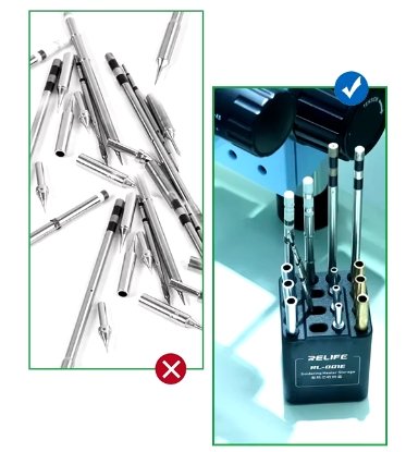 الترتيب الاستراتيجي: اجعل RL-001E نقطة الارتكاز. رتب رؤوس الكاوي (المستخدمة في إصلاحات معينة) في الفتحات المخصصة لها، بحيث تكون رؤوس الـ (Micro-soldering) في جهة، ورؤوس اللحام العام في جهة أخرى.