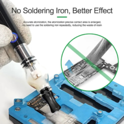 • توجيه دقيق للدخان: بفضل تصميم القلم، يمكنك وضع طبقة رقيقة وموحدة من الروسين على المكونات المشتبه بها (مثل المكثفات أو الآيسيات) دون تغطية البوردة كاملة، مما يسهل عليك رؤية المكون التالف بوضوح.