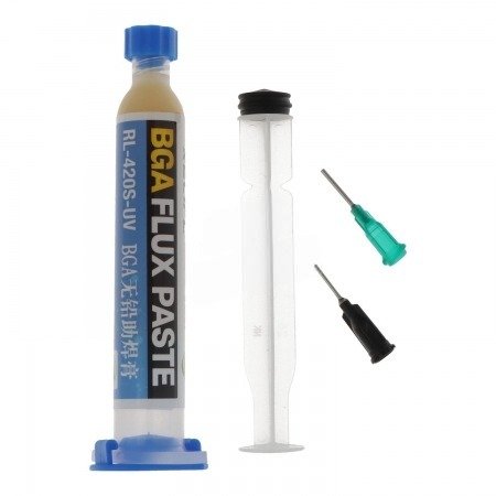 فك المكونات المحمية: عند فك آي سي محاط بمادة الحماية (Underfill)، يساعد RL-420S-UV في تليين الحماية وتوصيل الحرارة بشكل أسرع لنقاط اللحام تحت الآي سي. 🧪