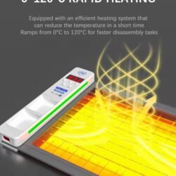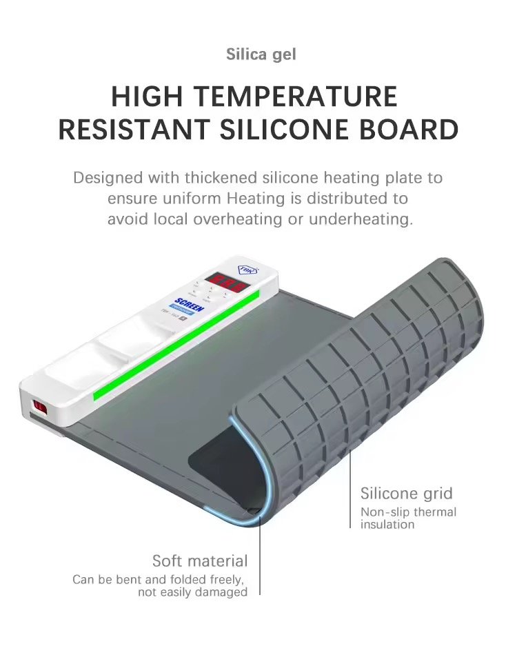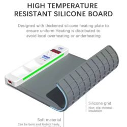 * نظام تسخين سريع ومتساوٍ: يعمل بقدرة 350 واط، ويوفر تسخيناً سريعاً جداً يصل من 0 إلى 120 درجة مئوية، مع لوحة سيليكون عالية الجودة تضمن توزيع الحرارة بانتظام ومنع التلف الحراري للشاشة .