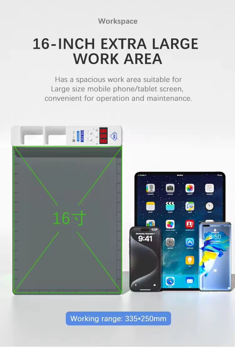 * مساحة عمل ضخمة: يتميز بسطح تسخين بمقاس 350 × 210 مم تقريباً (أو 14-16 بوصة)، مما يجعله مناسباً لفصل شاشات الأجهزة اللوحية الكبيرة وأجهزة النوت بوك بسهولة .