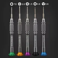 نظام الرؤوس المتبدلة (5-in-1 System): يأتي بمقبض واحد رئيسي مصنوع من سبائك الألومنيوم المقاومة للانزلاق، مع 5 رؤوس (Bits) دقيقة جداً يتم تخزينها أو تبديلها بسهولة.
